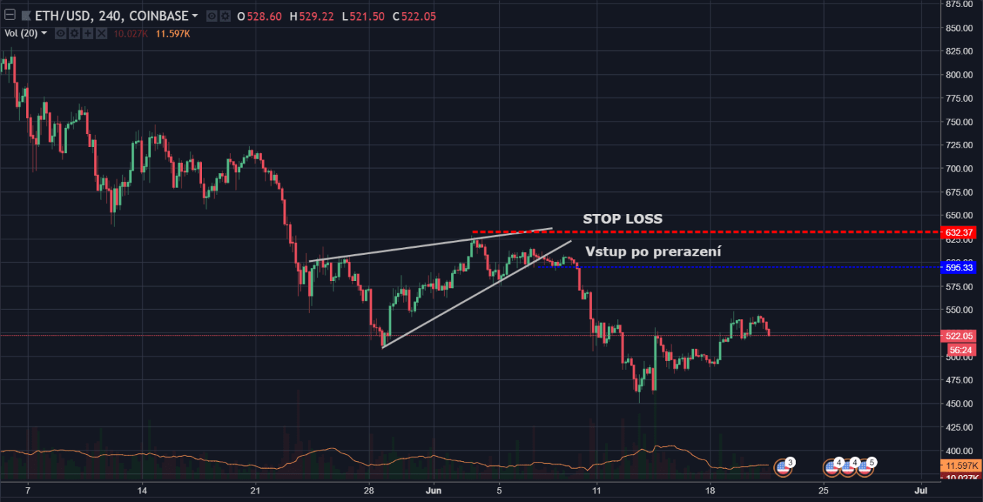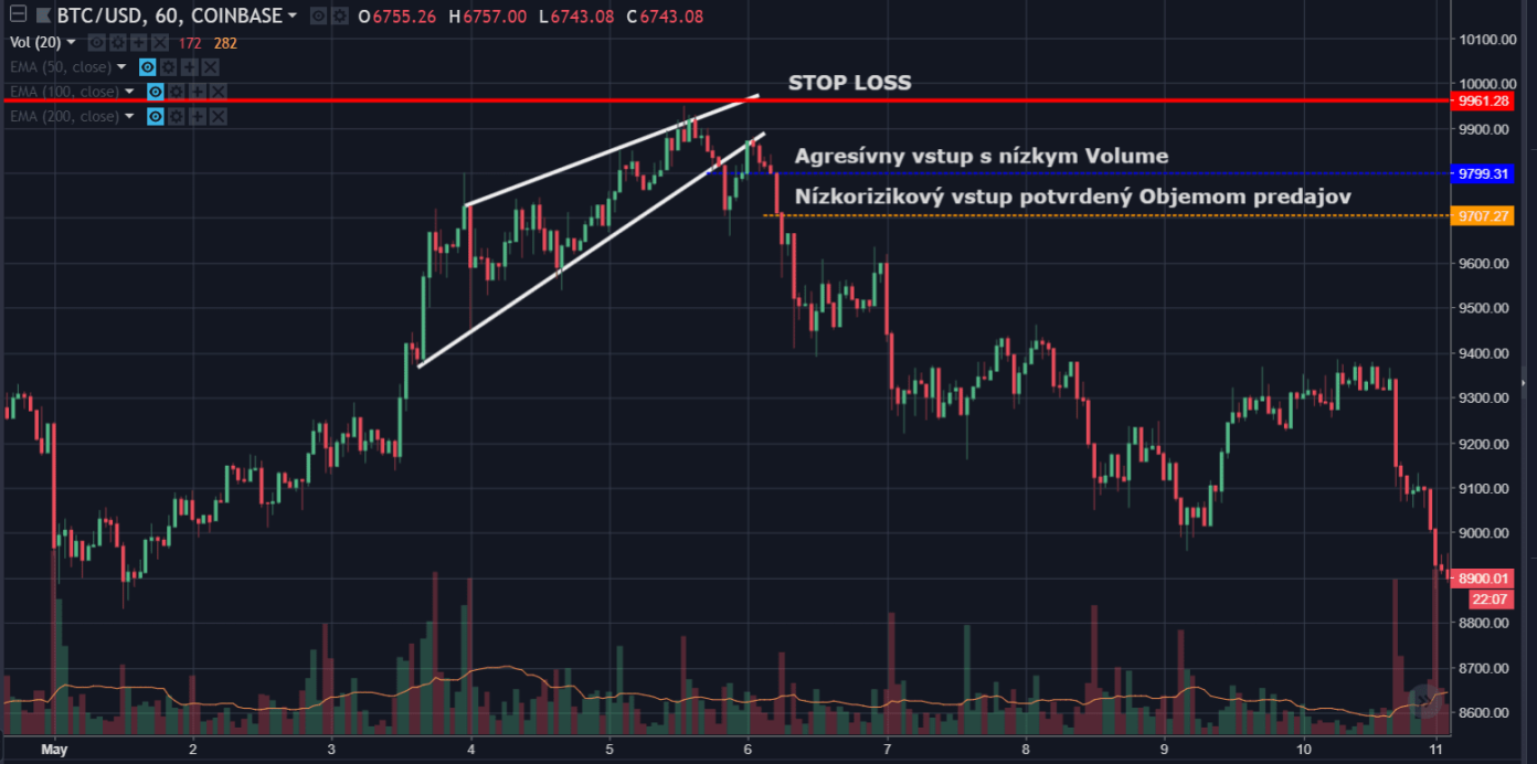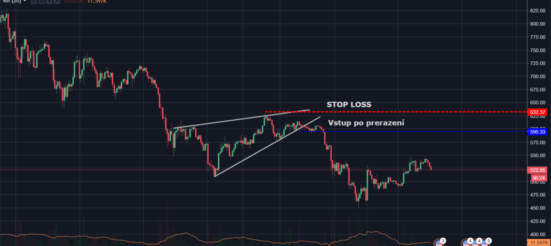 Prerazenie umožní obchodníkom vhodný vstup do obchodu. Síce obchodný signál prišiel, stále nemáme na trhu vysoký objem predávajúcich. Keďže bulls nemajú silu na vytlačenie a prerazenie naspäť do formácie, nasleduje dominancia predávajúcich. Príkaz Stop-loss nastavujeme nad úroveň poslednej rezistencie uptrendovej linky. Take profit nastavujeme podľa RRR (Risk Reward Ratio).